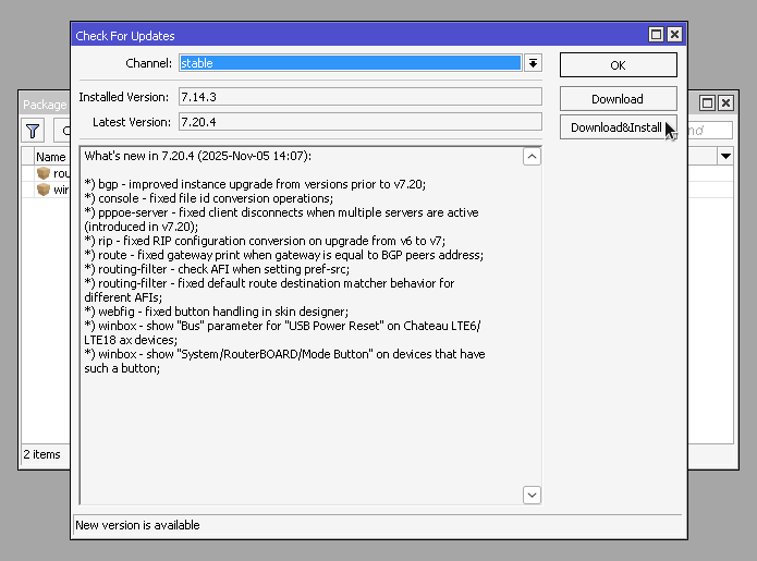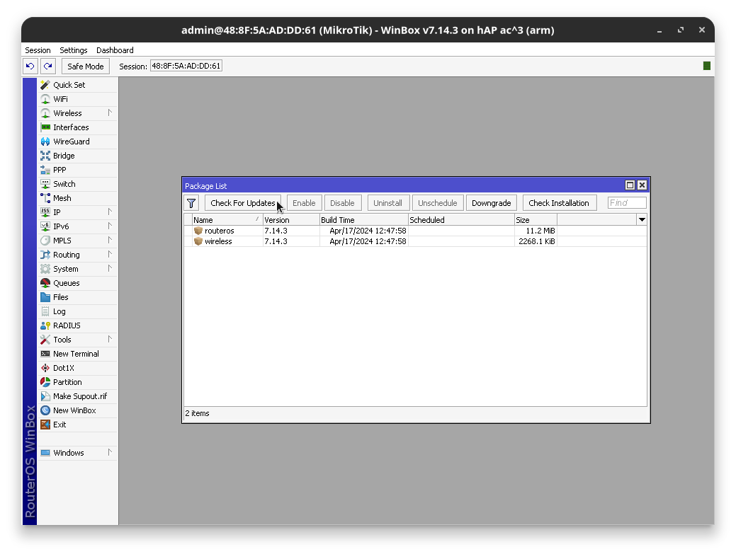 Para referência futura, estou usando a versão legada do WinBox (v3.43), baixada do site da MikroTik (a mais nova ainda é beta), o roteador MikroTik hAP ac³ e o novo Linux Kamarada baseado no Manjaro, mas o WinBox é feito para Windows e funciona igualmente bem nele. Também deve ser possível realizar essas atualizações pela interface web do MikroTik, os caminhos e telas são parecidos.