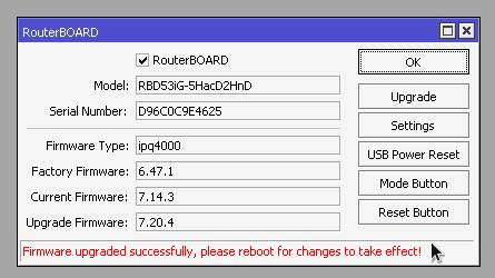 A janela RouterBOARD passa a informar que o firmware foi atualizado com sucesso e pede para reiniciar para aplicar as alterações: