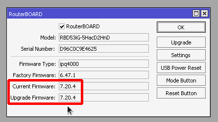 O roteador reinicia e, enquanto isso, o WinBox é desconectado. Quando o MikroTik terminar de reiniciar, se você reconectar o WinBox e voltar em System > RouterBOARD, verá que as versões indicadas em Current Firmware e Upgrade Firmware coincidem, indicando que o firmware está atualizado: