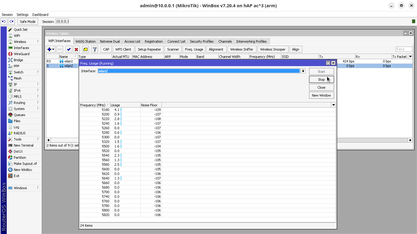 No caso da faixa de 5 GHz, também conseguimos usar o Freq. Usage (lembrar de mudar a Interface para wlan2):