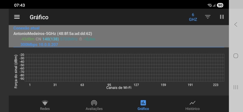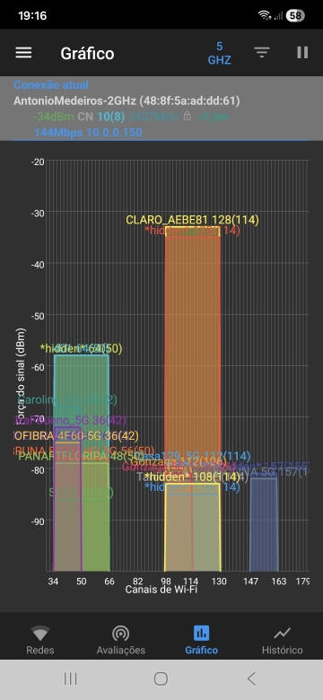 Assim como fizemos na parte 1 com a faixa de 2,4 GHz, vamos analisar a faixa de 5 GHz usando o aplicativo WiFiAnalyzer (lembrando que nas abas Gráfico e Avaliações devemos mudar para a faixa de 5 GHz, há uma opção para fazer essa mudança na parte superior da tela):