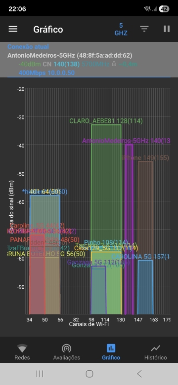Note que a rede AntonioMedeiros-5GHz agora ocupa frequências livres de interferência com outras redes.