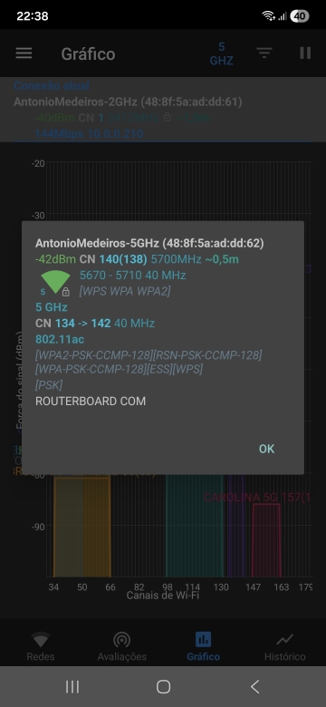 Curiosamente, meu roteador MikroTik na configuração padrão não fornecia uma rede de 5 GHz que eu conseguisse conectar pelo computador ou pelo celular. Pode reparar que a rede (AntonioMedeiros-5GHz) não aparece no gráfico acima. Não sei o motivo de isso acontecer (se você souber, por favor, comente), mas depois com a configuração manual consegui selecionar um bom canal sem interferências que consigo usar tanto no computador quanto no celular.